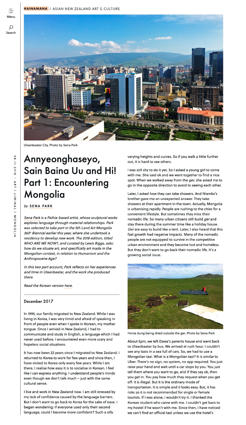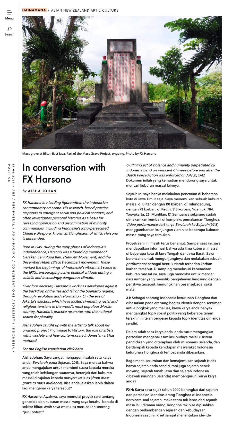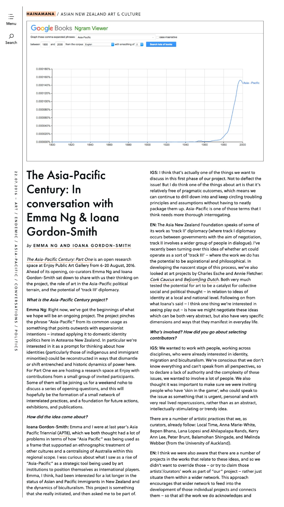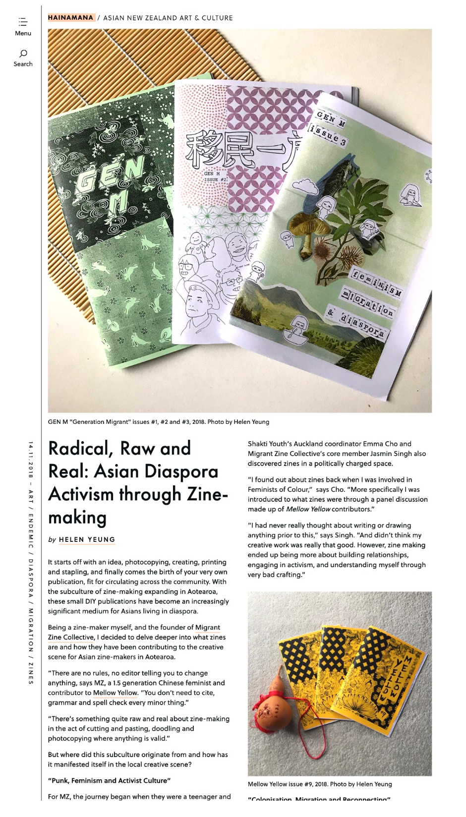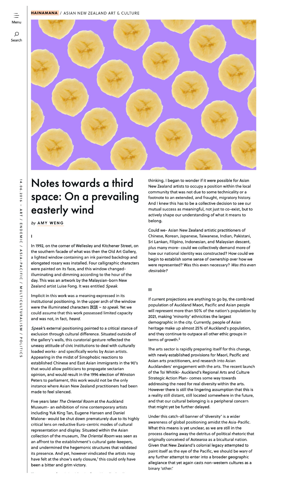 Hainamana was a magazine-style arts and culture website, established by writer, editor and curator Amy Weng to foster discourse within Asian New Zealand artistic spaces. Founded in 2016, it ceased publishing in 2020 but remains accessible online. The website’s name is the te reo Māori word transliteration of ‘Chinaman’, and its use is part of a movement by Asian people living in Aotearoa to reclaim the word.