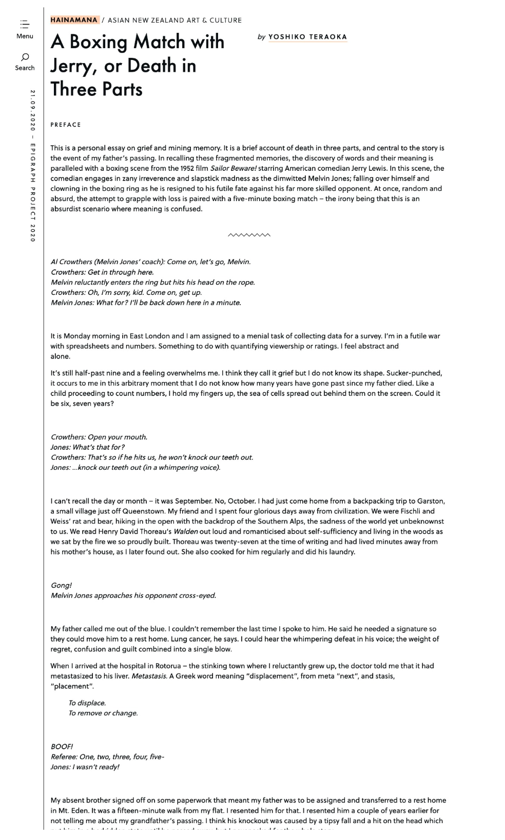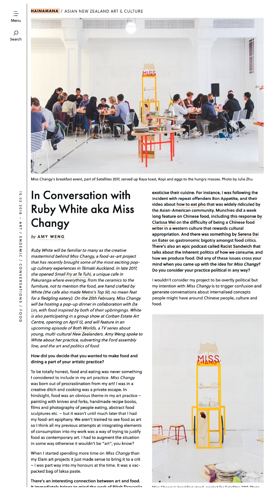 In 2019, Hainamana received a grant from Mātātuhi Foundation, enabling the commission of eight new pieces of original writing alongside profiles, with this suite of publishing co-edited by Weng and writer Alison Wong.