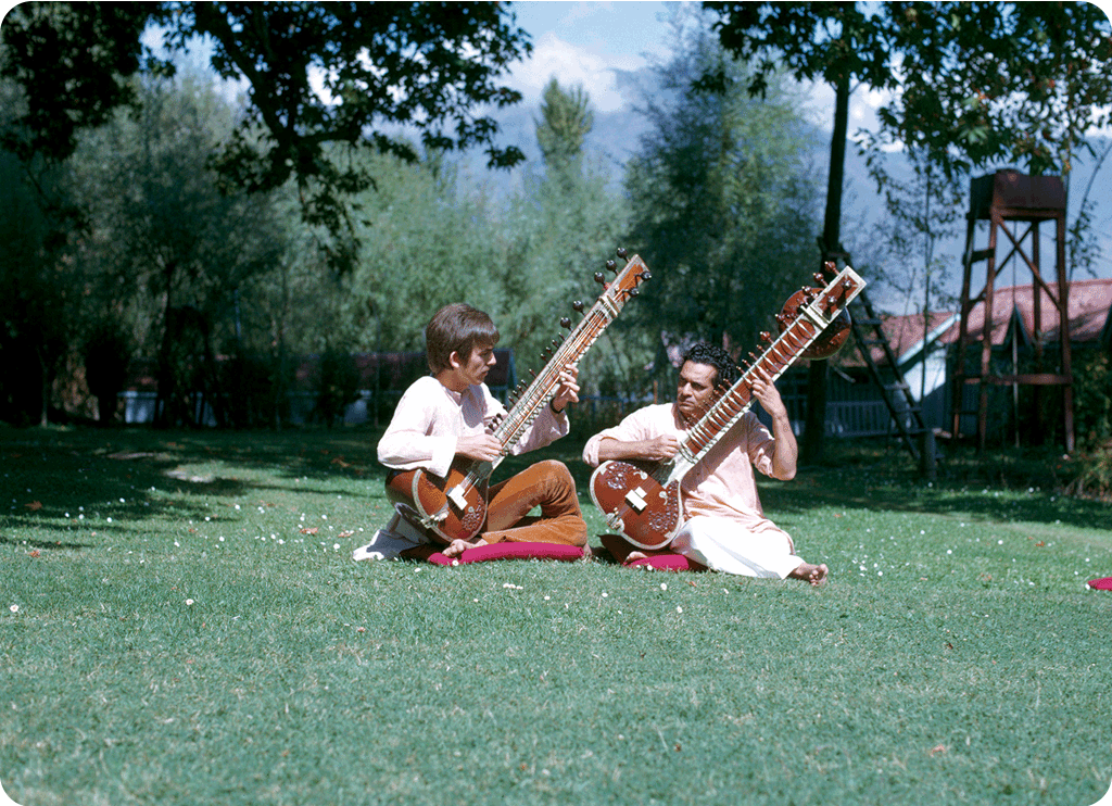 George Harrison studying the sitar with Pandit Ravi Shankar, probably 1968