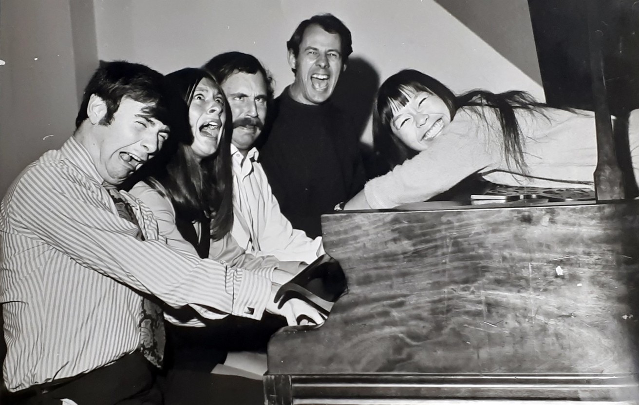 Helene Wong with John Clarke, Roger Hall, Dave Smith and Cathy Downe as the cast of the Victoria University of Wellington revue One in five, 1971