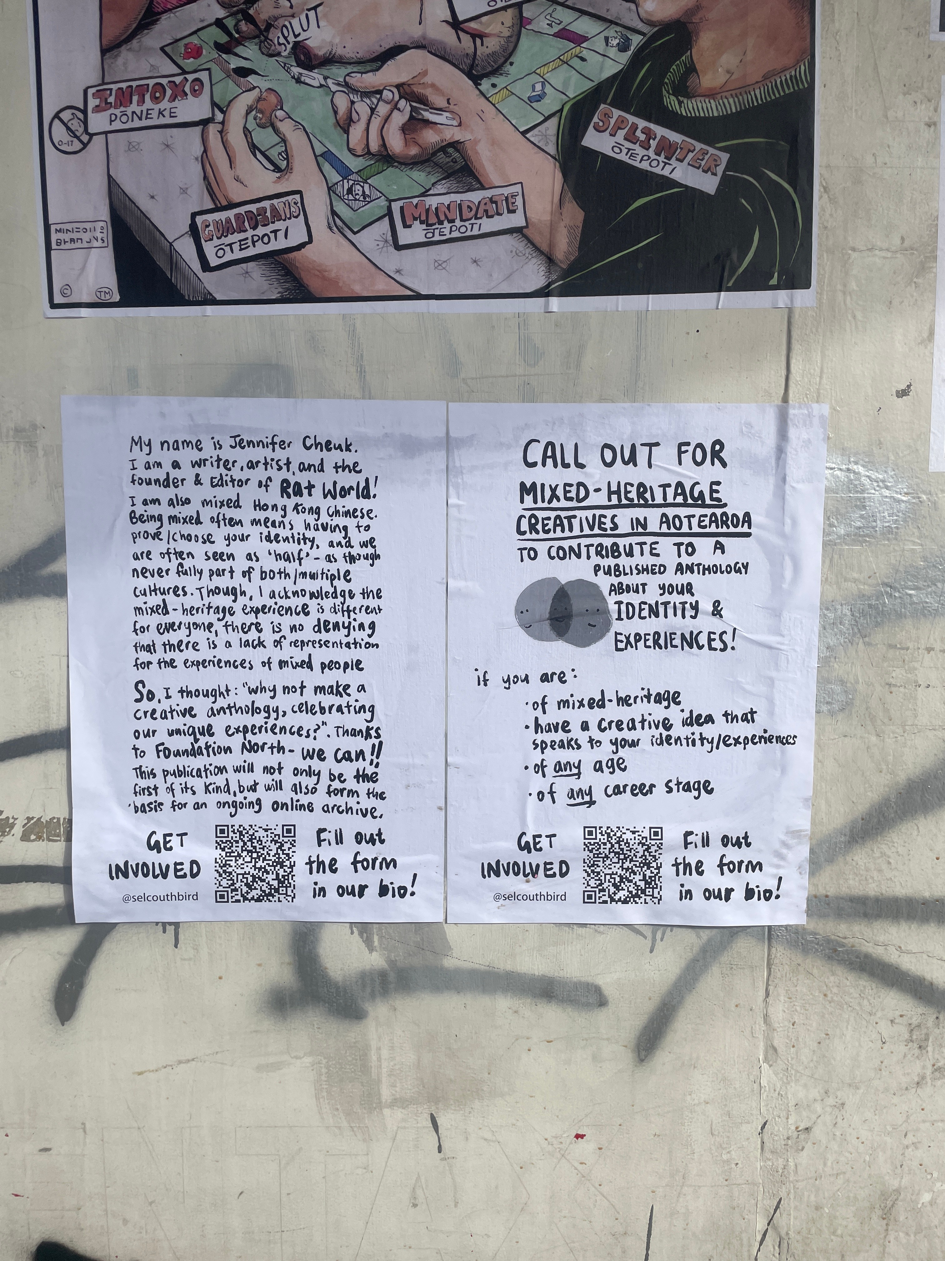 Jennifer Cheuk, call for submissions for the book that would become Everything That Moves, Moves Through Another: An anthology from mixed heritage creatives in Aotearoa, pasted up in Ōtepoti, 2023