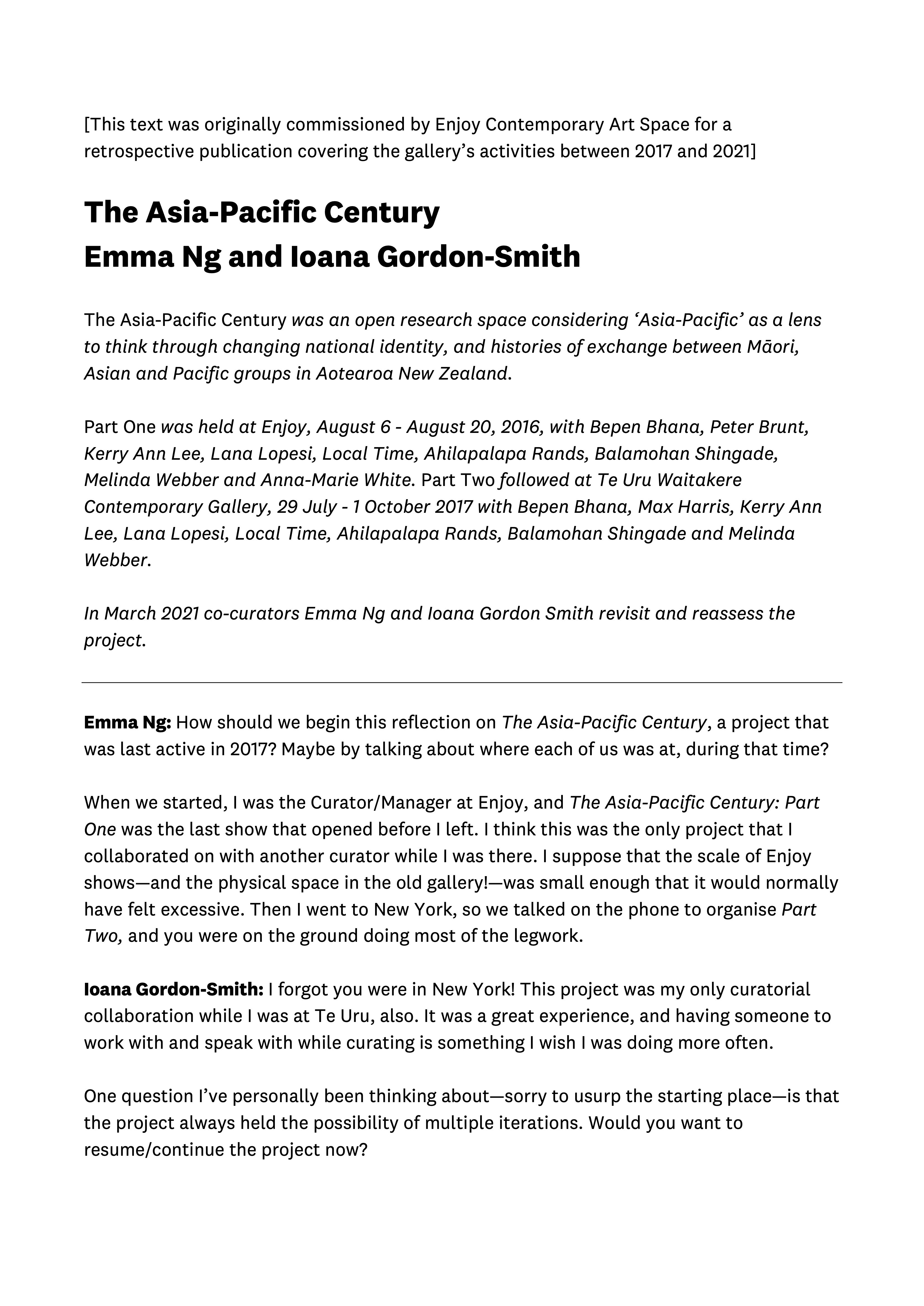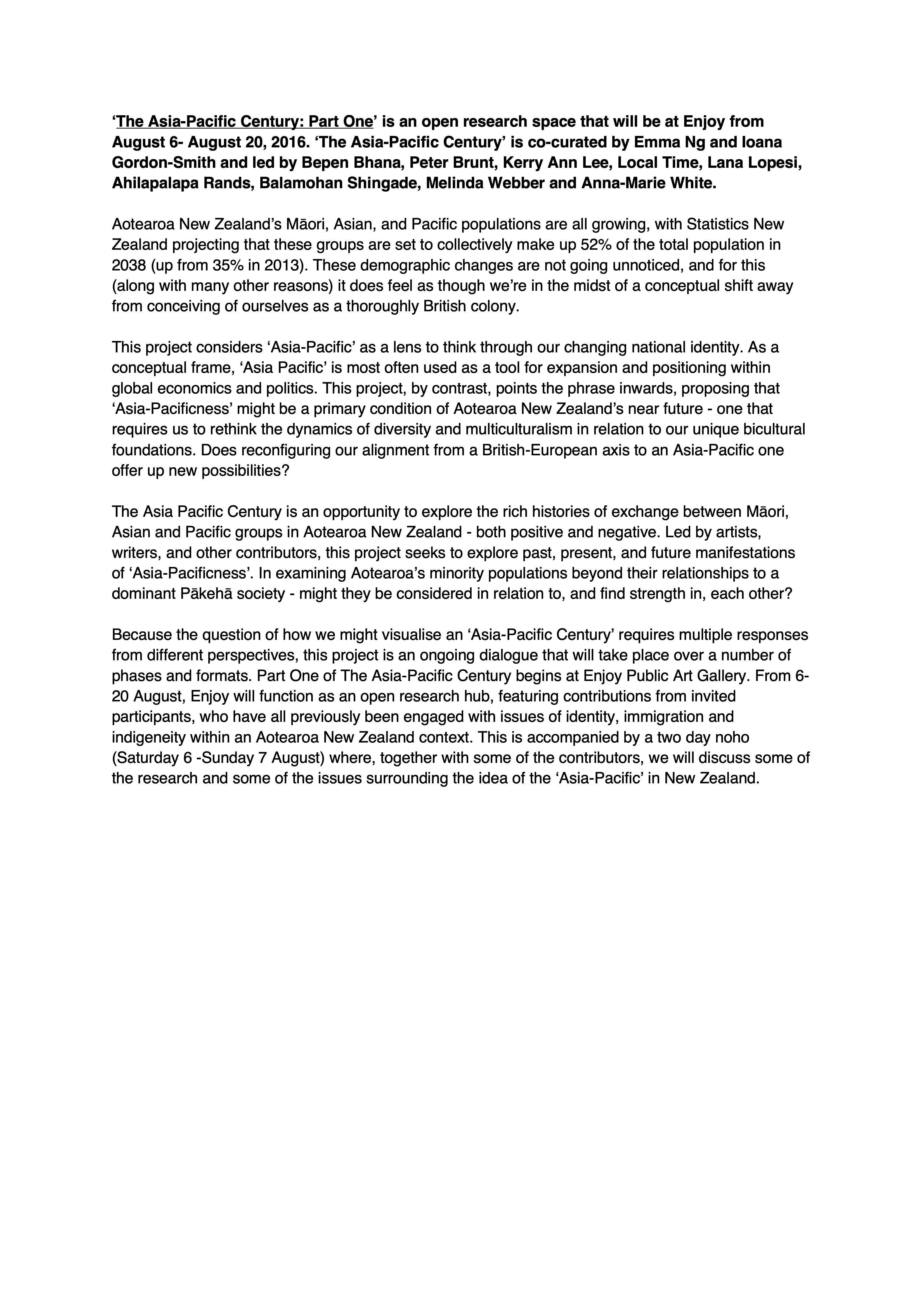 The Asia-Pacific Century: Part I took the form of a research hub at Enjoy, featuring contributions from invited participants whose existing research or practice engages with issues of identity, immigration and indigeneity within the context of Aotearoa. Contributors included Bepen Bhana, Peter Brunt, Kerry Ann Lee, Local Time, Lana Lopesi, Ahilapalapa Rands, Balamohan Shingade, Melinda Webber and Anna-Marie White — and their contributions ranged from reading material to artworks, to conversation transcripts, to slideshows. A two-day noho gathered together some of the contributors to begin discussing issues emerging from this idea of the 'Asia-Pacific'.
