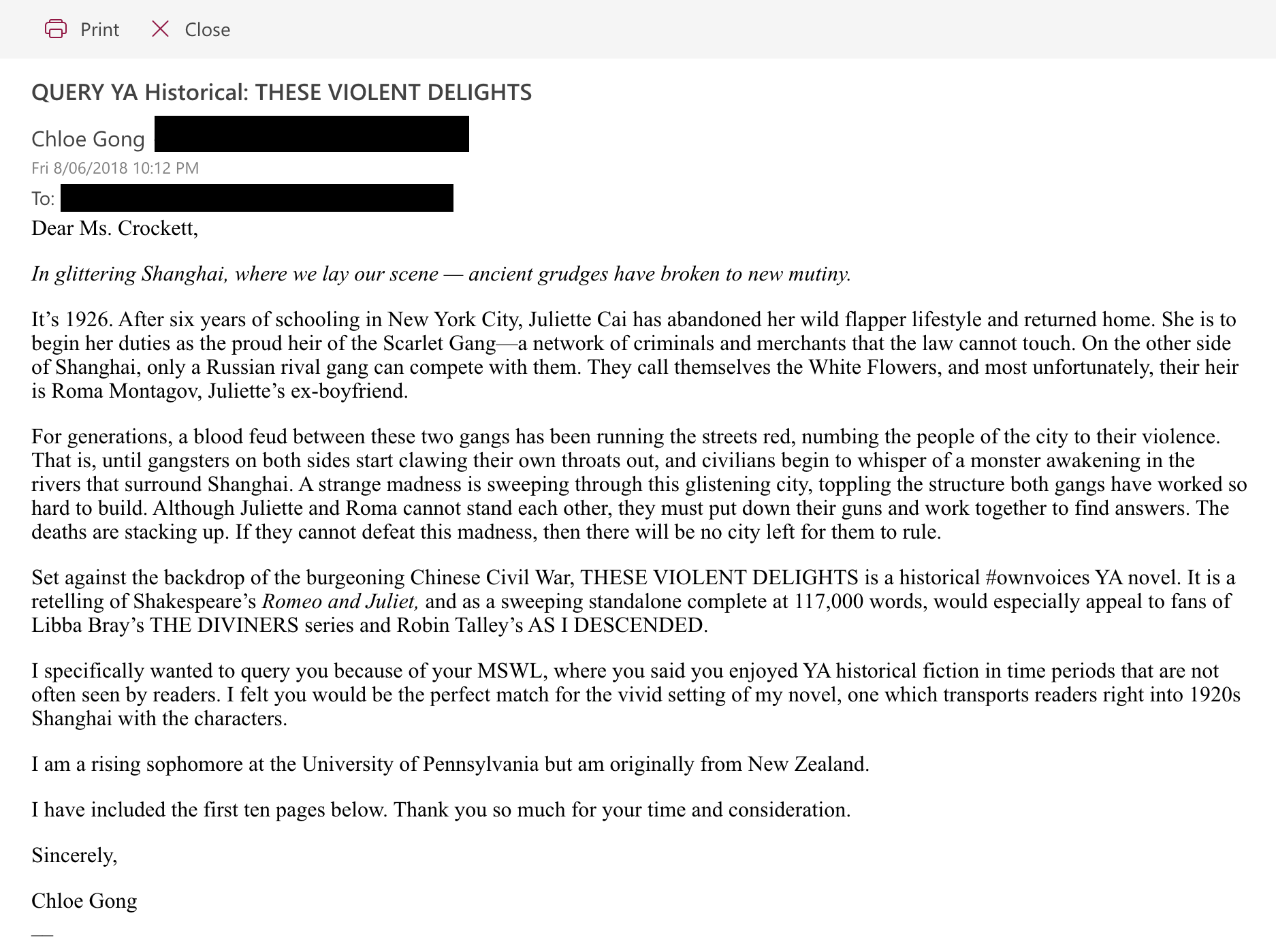 In an interview with F(r)iction, Gong said: “From about thirteen onwards, whenever I was writing a book, that character would be my age, because as I was growing up, I was putting myself into the pages.” She grew up mainly reading young adult fiction and said she “loved it when there’s a plot but also a couple to root for in the sub-plot”. Gong said the main theme in These Violent Delights was “to choose love in a place of hate”. In an interview with Newsroom, she cited young adult fantasy authors Cassandra Clare and Laini Taylor as inspirations.
