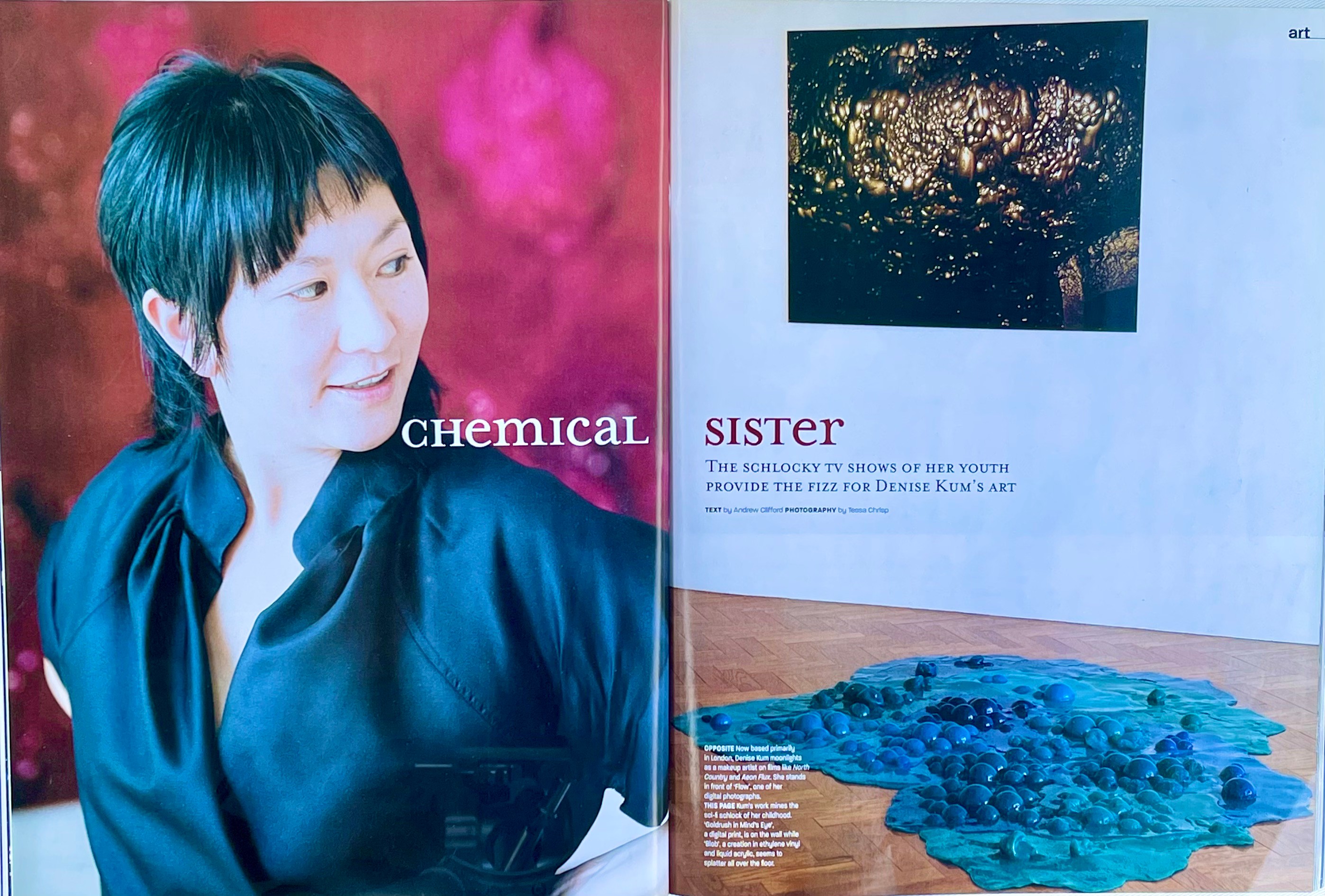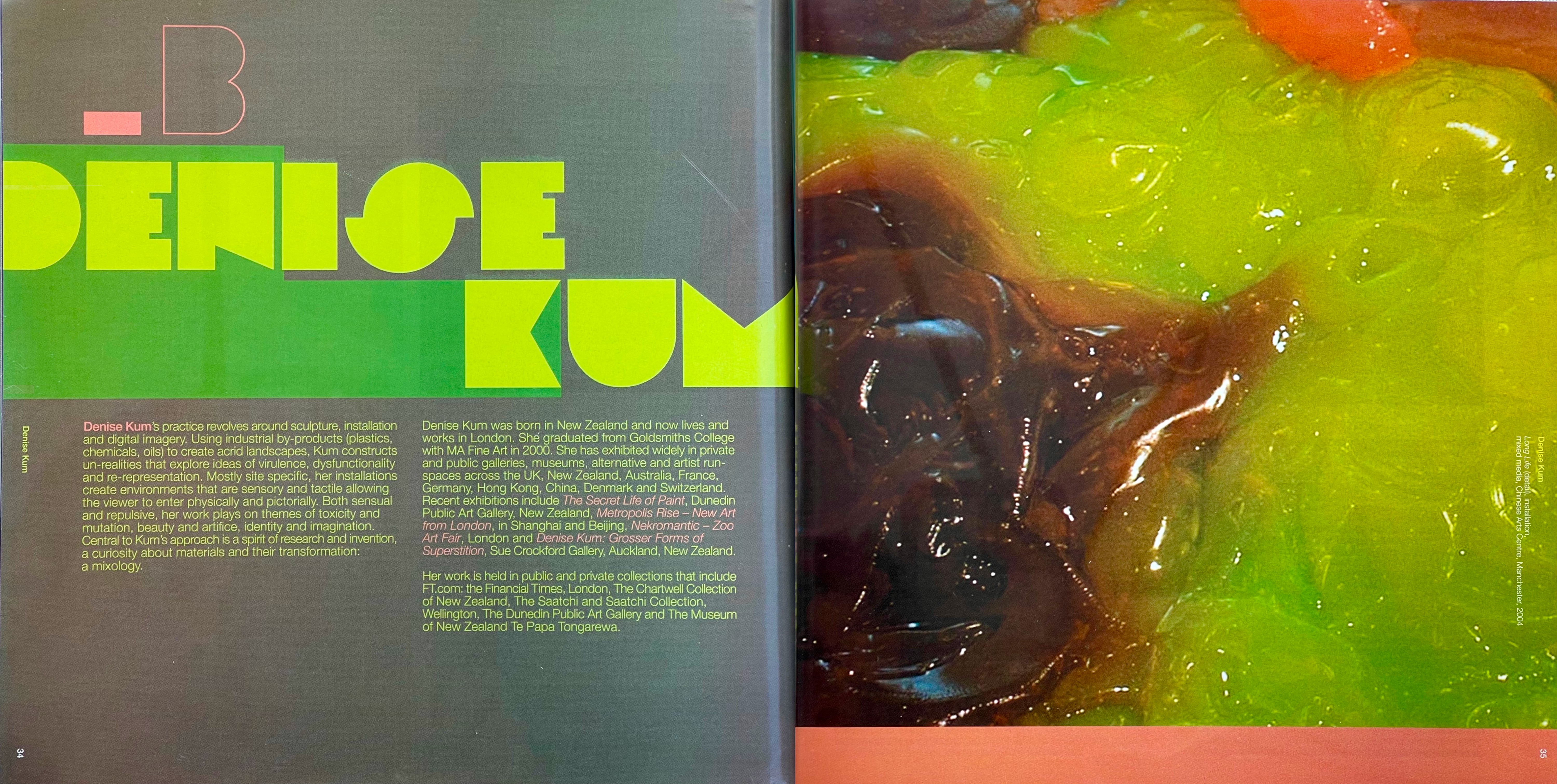 Denise Kum is a Chinese New Zealand visual artist and designer based in London. Known for using unconventional materials such as foodstuffs and synthetic substances, Kum’s sculptural work explores processes of decay and mutation. Alongside Yuk King Tan, Simon Kaan, Luise Fong and Haruhiko Sameshima, Kum was part of a small group of Aotearoa Asian artists who came to prominence during the 1990s. Kum is also an acclaimed makeup and hair designer working in fashion, film and television — a vocation she began whilst still at art school.