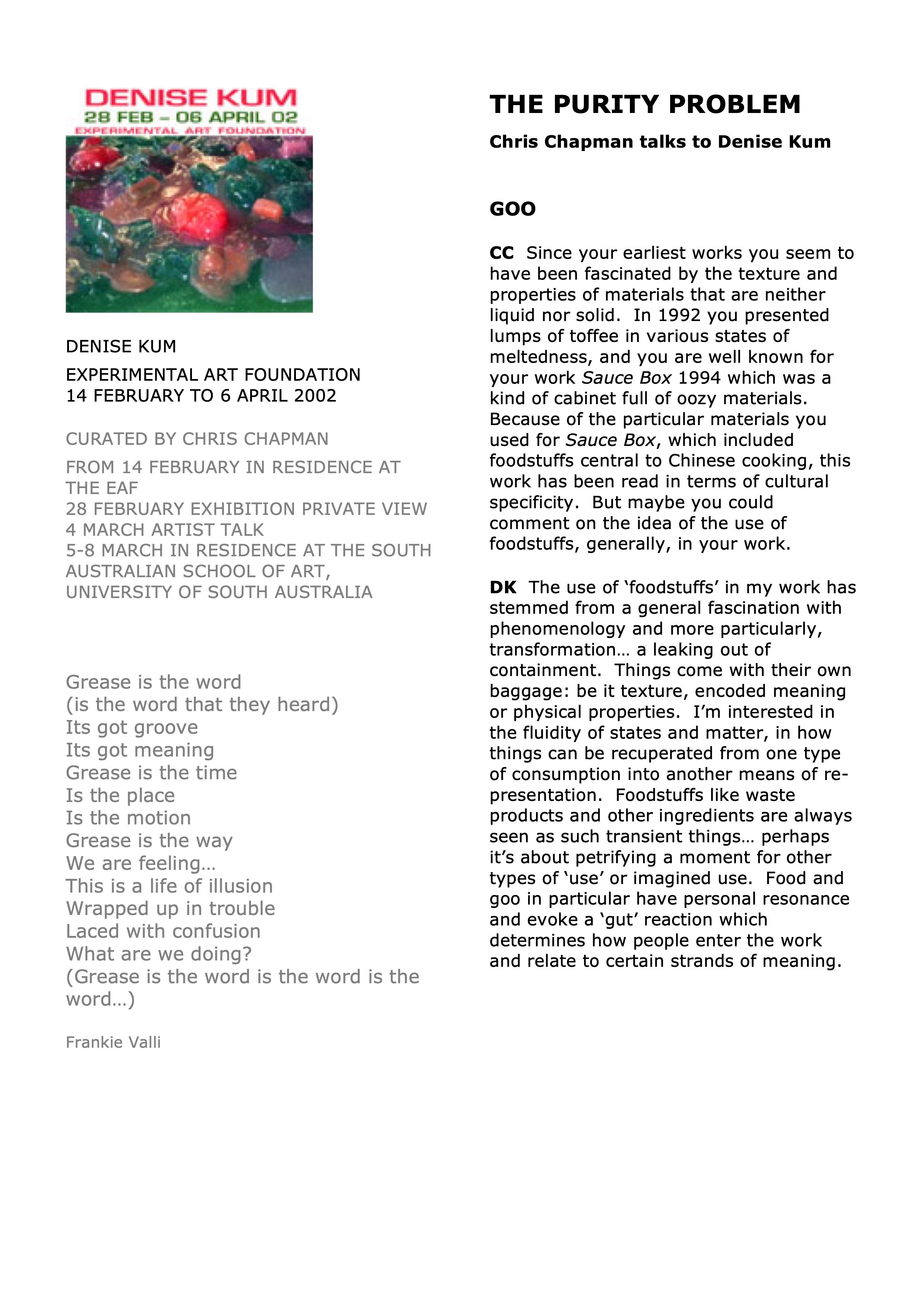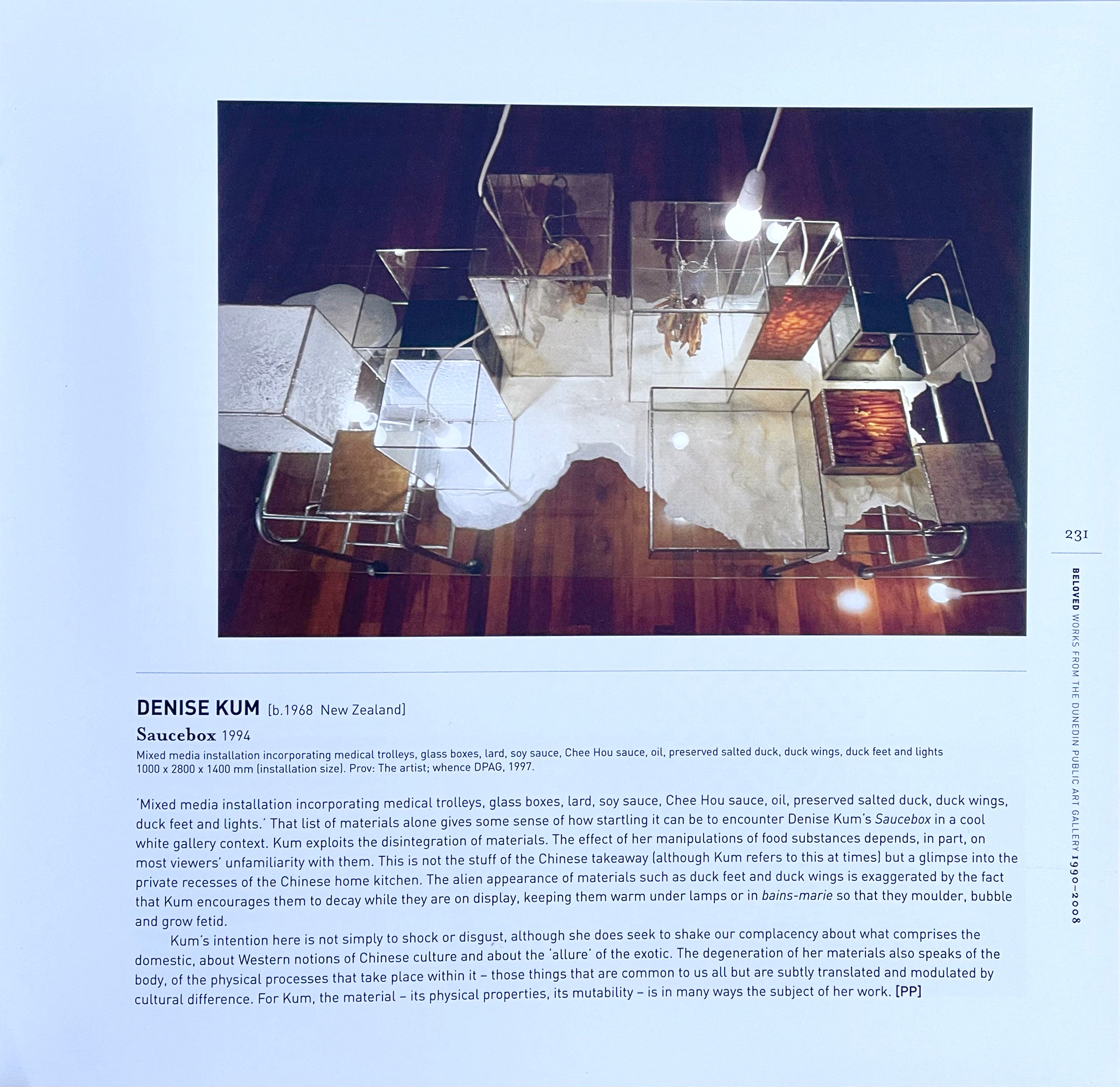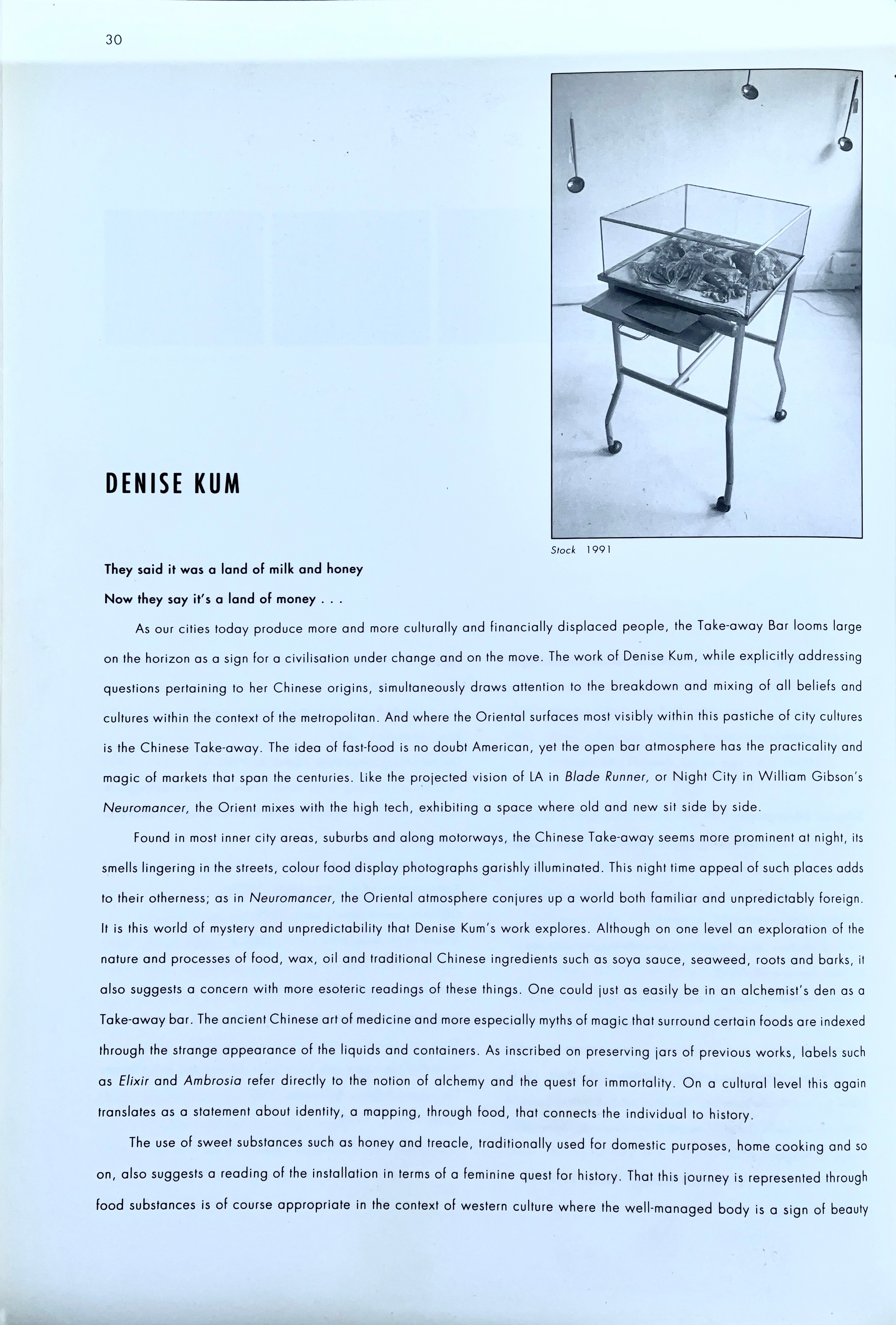 Sauce Box (1993), exhibited in Localities of Desire, included some of the ingredients for a meal of Peking duck arranged within glass boxes on stainless steel hospital trolleys. The work was described by fellow founding member of Teststrip, Giovanni Intra (1968–2002) in his essay on Kum for Art & Text 52, 1995, 'Toxic Taste':
