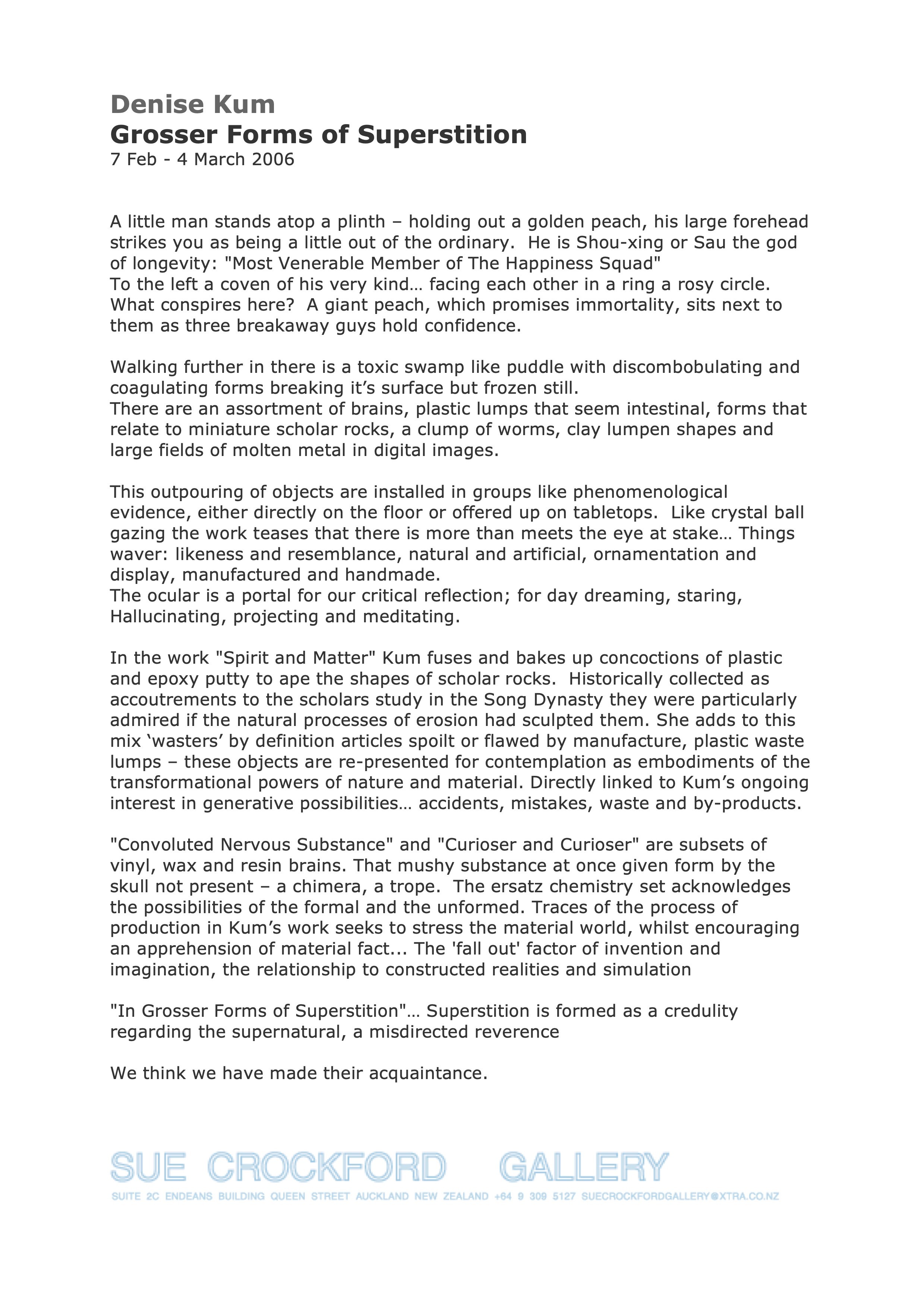Kum left Aotearoa for London in 1999, where she gained a Masters in Fine Arts at Goldsmiths College in 2000 and her work became further characterised by distinctive overflowing forms. Using byproducts of petroleum with colours of toxic brightness, her large-scale installations — such as Flocculate Flow (2003), shown in Bloom: mutation, toxicity and the sublime (2003–2004) at the Govett Brewster Gallery — covered the floor with a mutant, geothermal landscape of pools and protrusions spilling into each other underneath a boardwalk-style pathway.