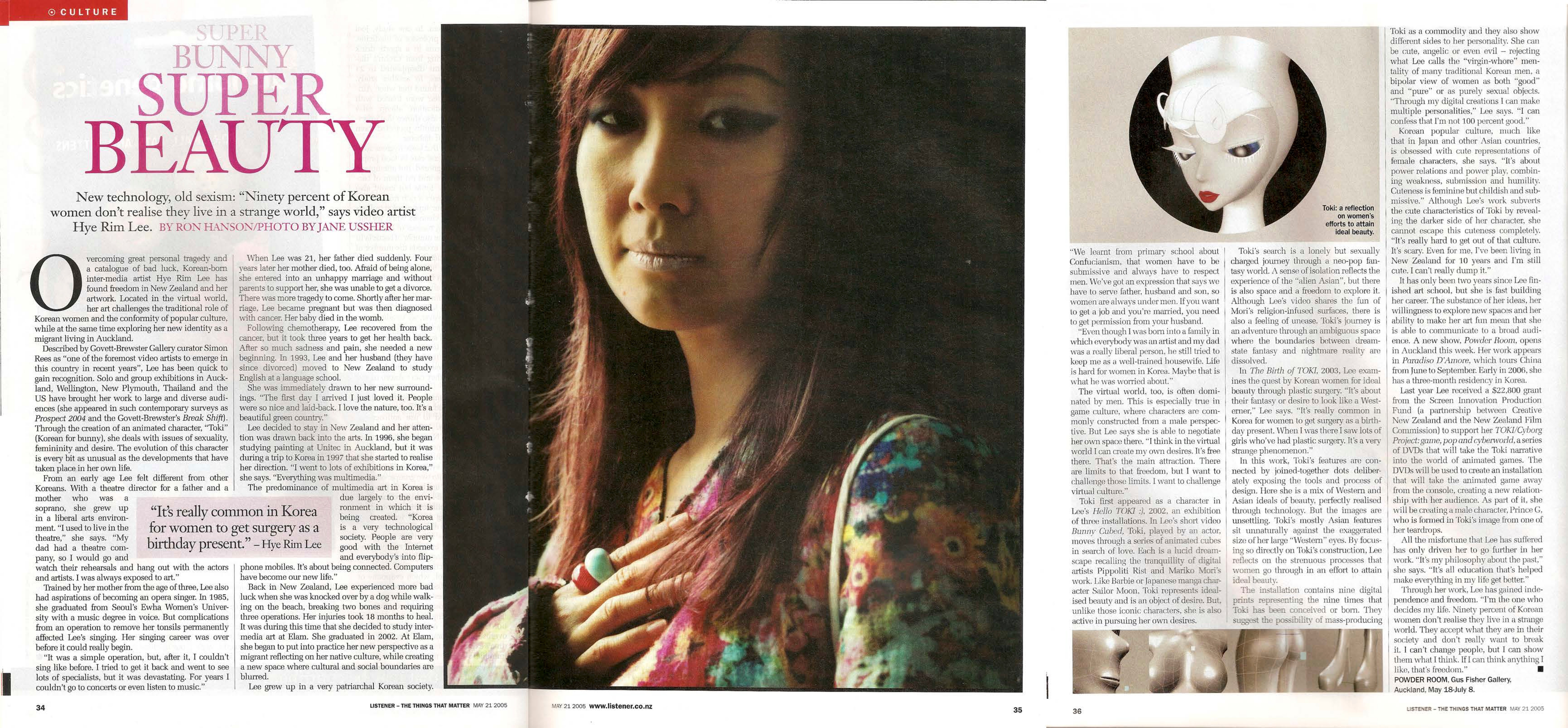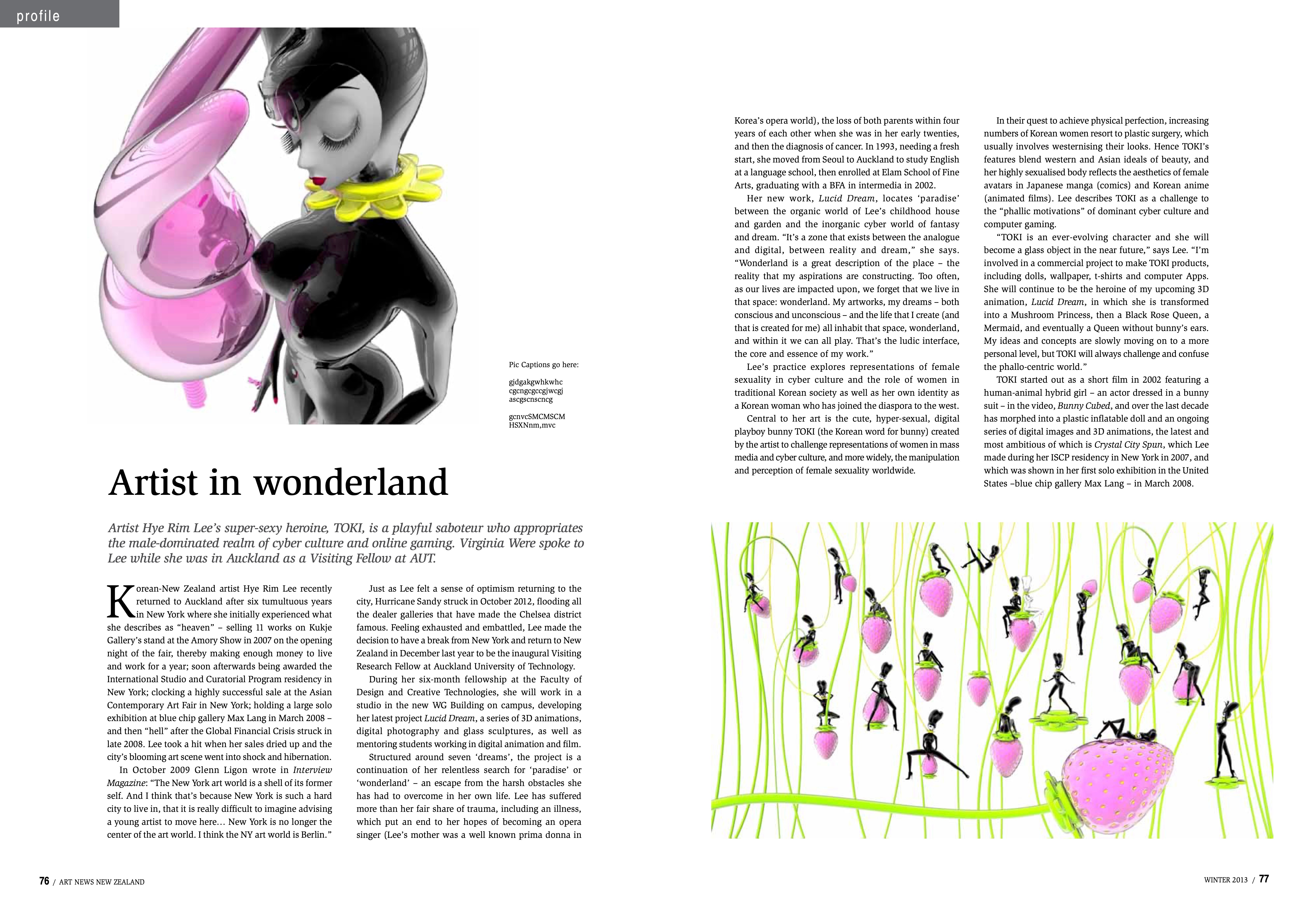 Hye Rim Lee is a visual artist known for her computer-generated images and animations, many of which feature a recurring character called TOKI, a feminine cyborg. Lee’s work has been widely shown internationally, and she has spent time living and exhibiting in New York, Seoul, and Tāmaki Makaurau.