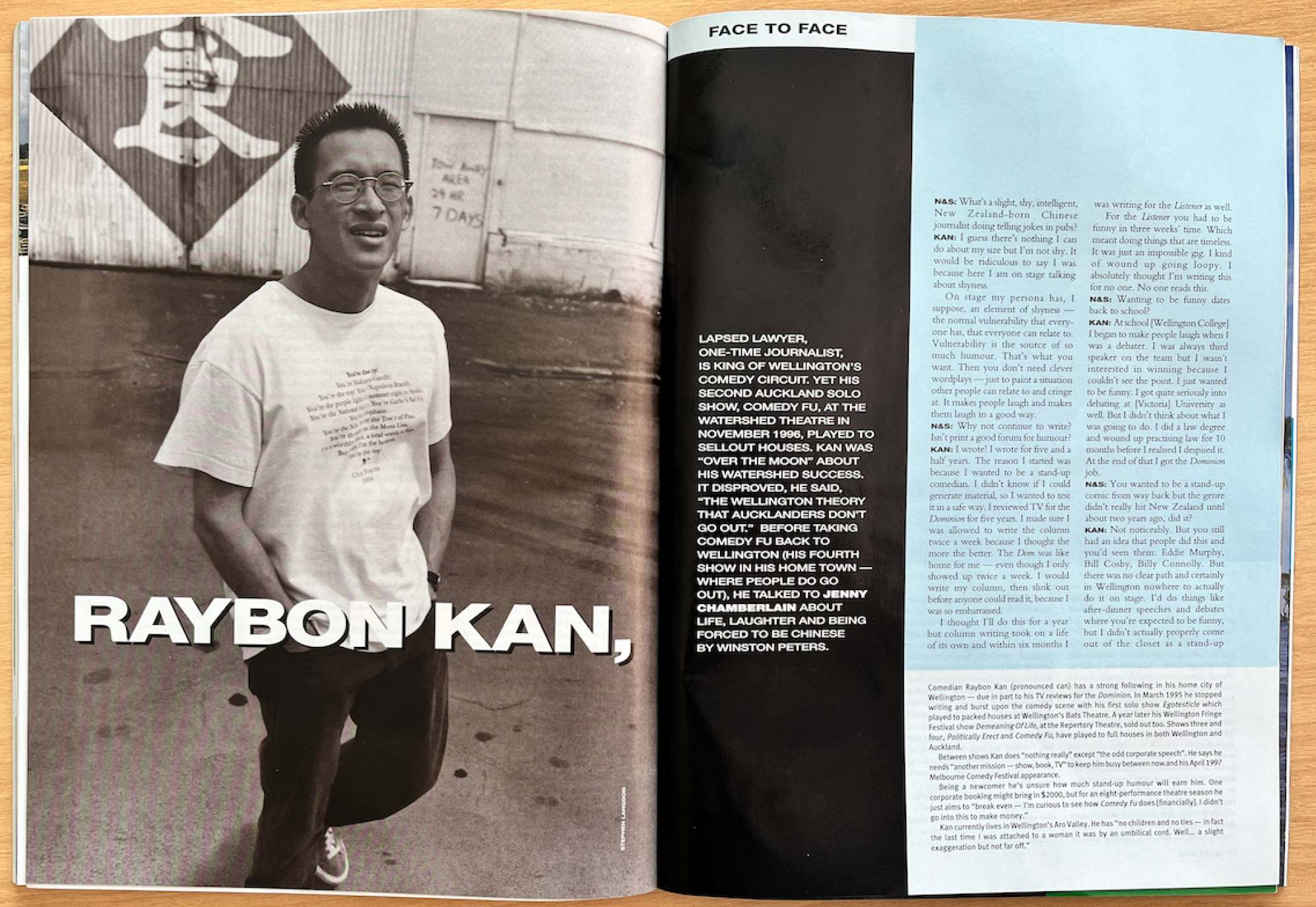 Kan was writing during a period in Aotearoa when there were not yet comedy clubs or a comedy festival — but then “someone had an idea in Wellington to do a comedy night at a bar on a Sunday.” It was 1994. It was a new concept, and they got in touch with Kan to take part. “It didn’t go terribly,” he remembers. “And that was the very first time I did something where it was called ‘comedy’.” In an email exchange, he recalls: