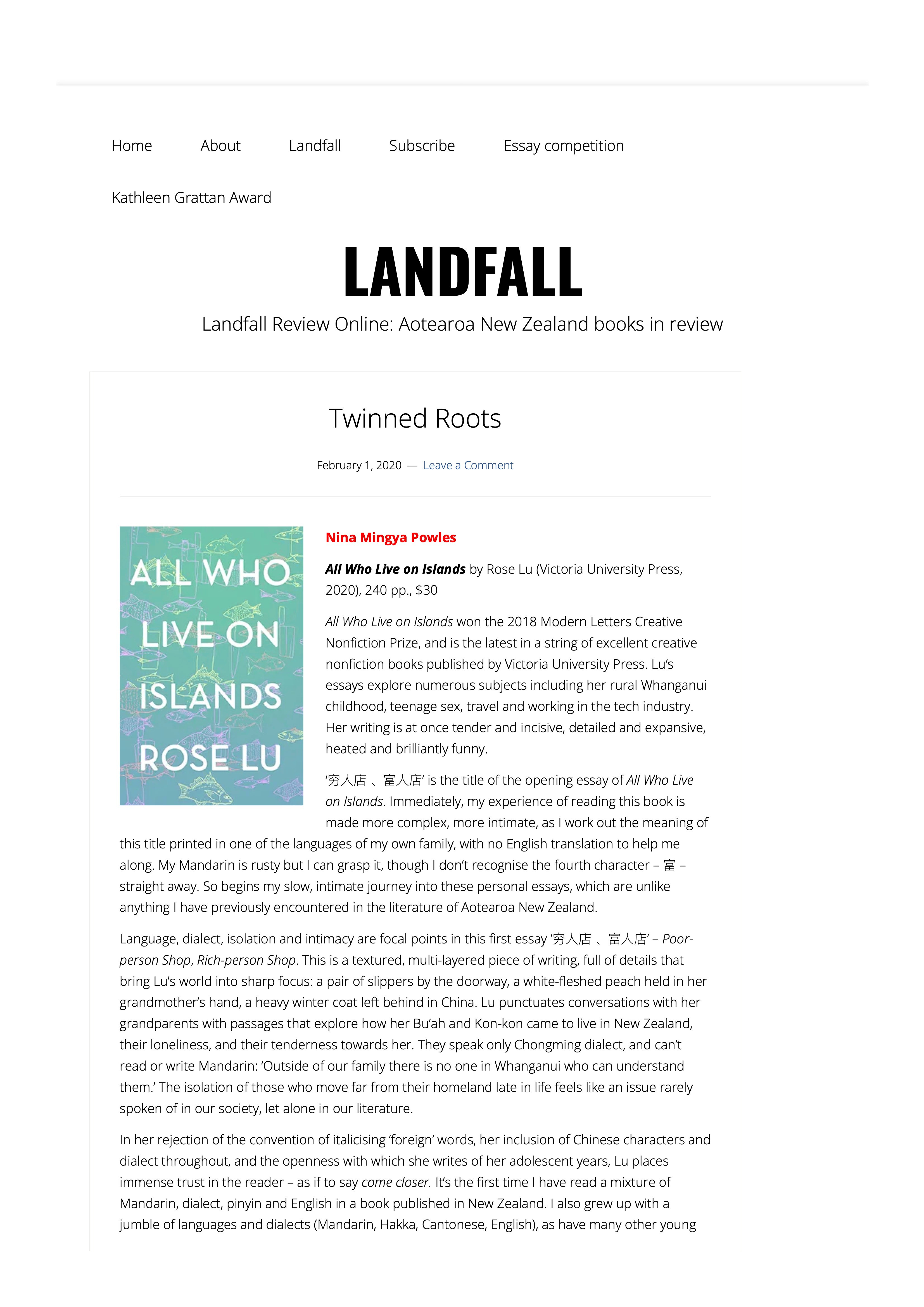 Her essay collection, All Who Live on Islands, was developed during this time and was awarded the Creative Nonfiction Prize at the Institute of Modern Letters. It features nine autobiographical essays that reflect on Lu’s experiences as a 1.5 generation Chinese New Zealander, particularly one who grew up in smaller towns such as Whanganui and Palmerston North.
