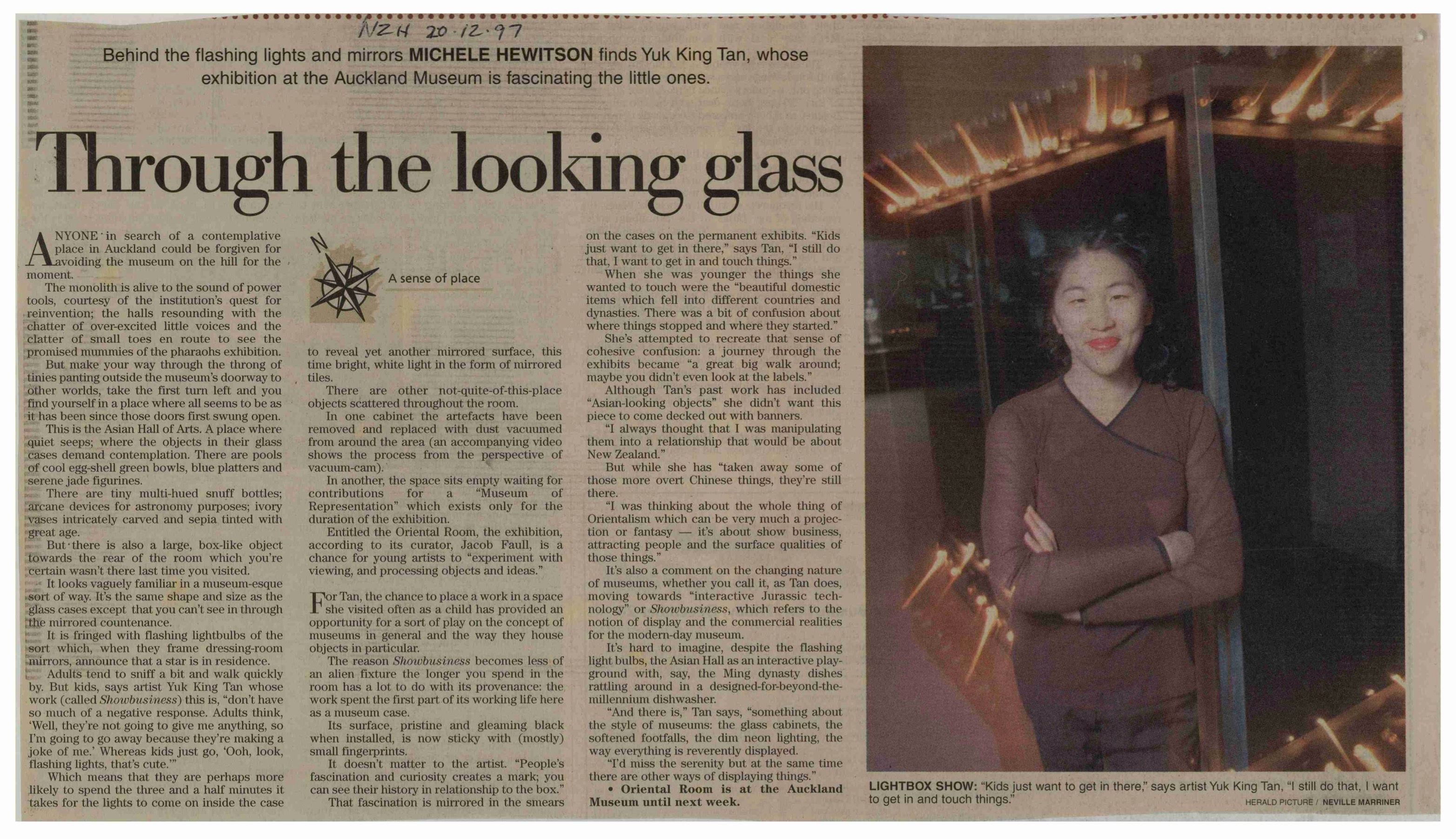 Tan’s work was soon picked up by public galleries around the country, as well as art spaces abroad. From the mid-1990s onwards, she was included in a number of international exhibitions, including Localities of Desire at the Museum of Contemporary Art, Sydney, the 1996 Asia-Pacific Triennial in Brisbane, Fusion and TransFusion (an exchange between Hong Kong and Auckland), and Toi Toi Toi, which presented contemporary art from New Zealand in Kassel, Germany, in 1999. She also took part in artist residencies in Aotearoa, Australia, Europe, and the United Kingdom.