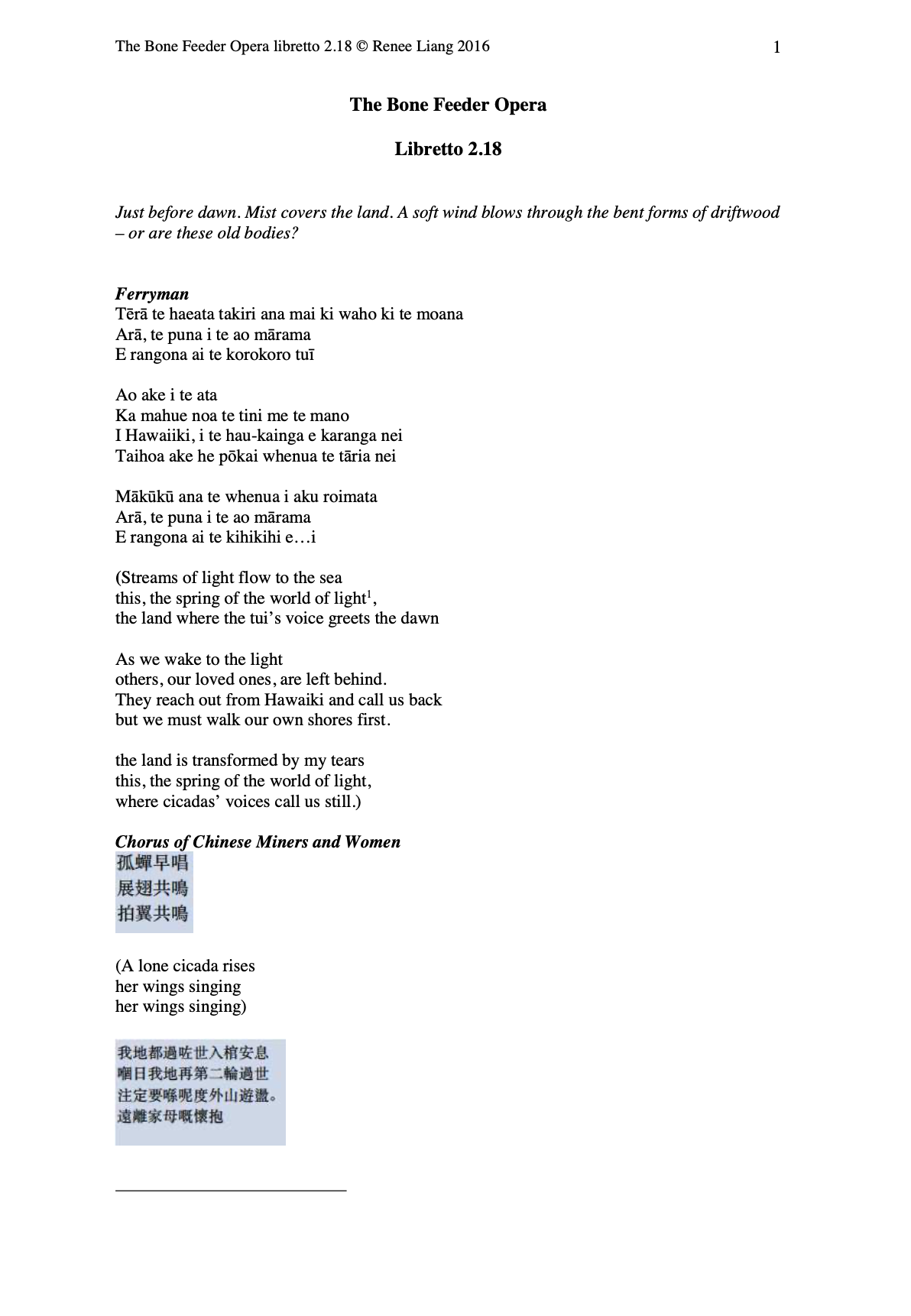 The Bone Feeder is an opera that was commissioned by Auckland Arts Festival in 2015 and presented in association with New Zealand Opera, with a libretto written by playwright Renee Liang and music composed by Gareth Farr. Moving between the present day and the late 19th century, it tells the story of the SS Ventnor, a ship that was taking the bodies of 499 Chinese gold miners back to Guangdong in 1902, to be buried in their villages. The ship sank off the coast of the Hokianga harbour and while some of the bones and coffins washed ashore — with local iwi taking care of the remains and burying them — many of the bodies remained lost.
